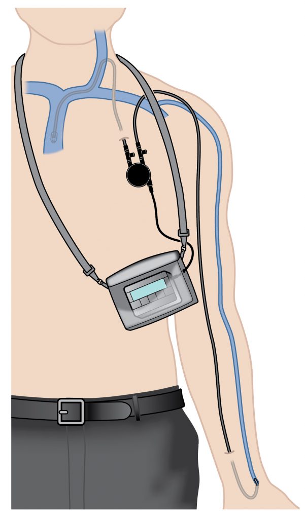 Flexible catheter placed in the central venous system to connect to the patient’s bloodstream